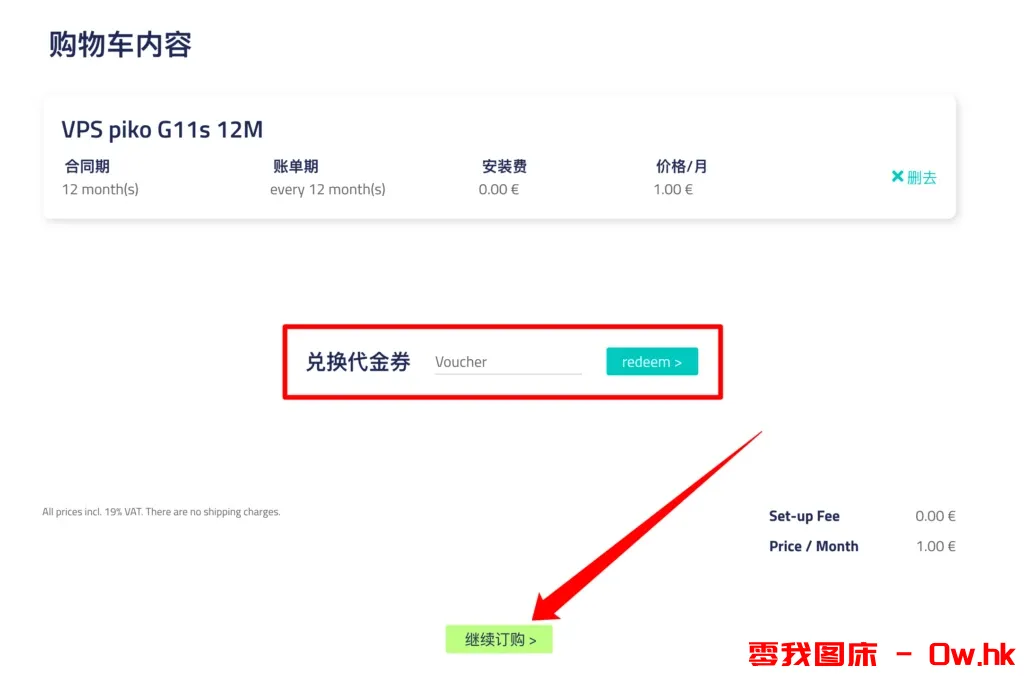 再次弹出购物车内容,点击继续订购。订购官网其它套餐可使用代金券(教程底部会发出10个5欧元的代金券,仅限新用户使用),这款1O不支持使用代金券。