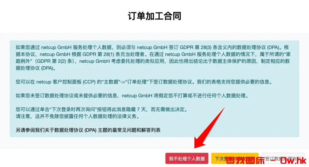登录账号后首先会提示订单加工合同这个弹出窗口,我们按需选择,没有个人数据需要处理,直接点击“我不处理个人数据”