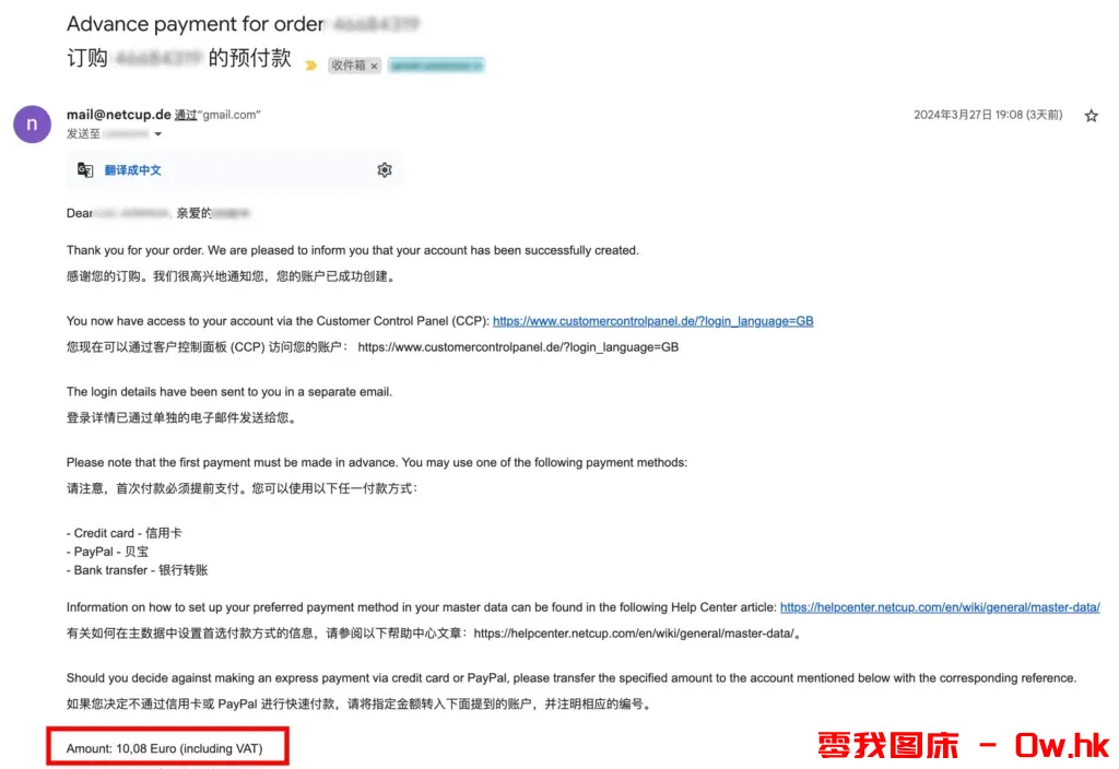 可以看到底部红色框中的金额为 10.08欧元,此时我们登录 CCP 账号,就可以看到待支付的订单。支付该订单,可以选择 Paypal 或 银行卡,之后就会收到实例开机的邮件,邮件中会告知实例的 IP和登录密码。